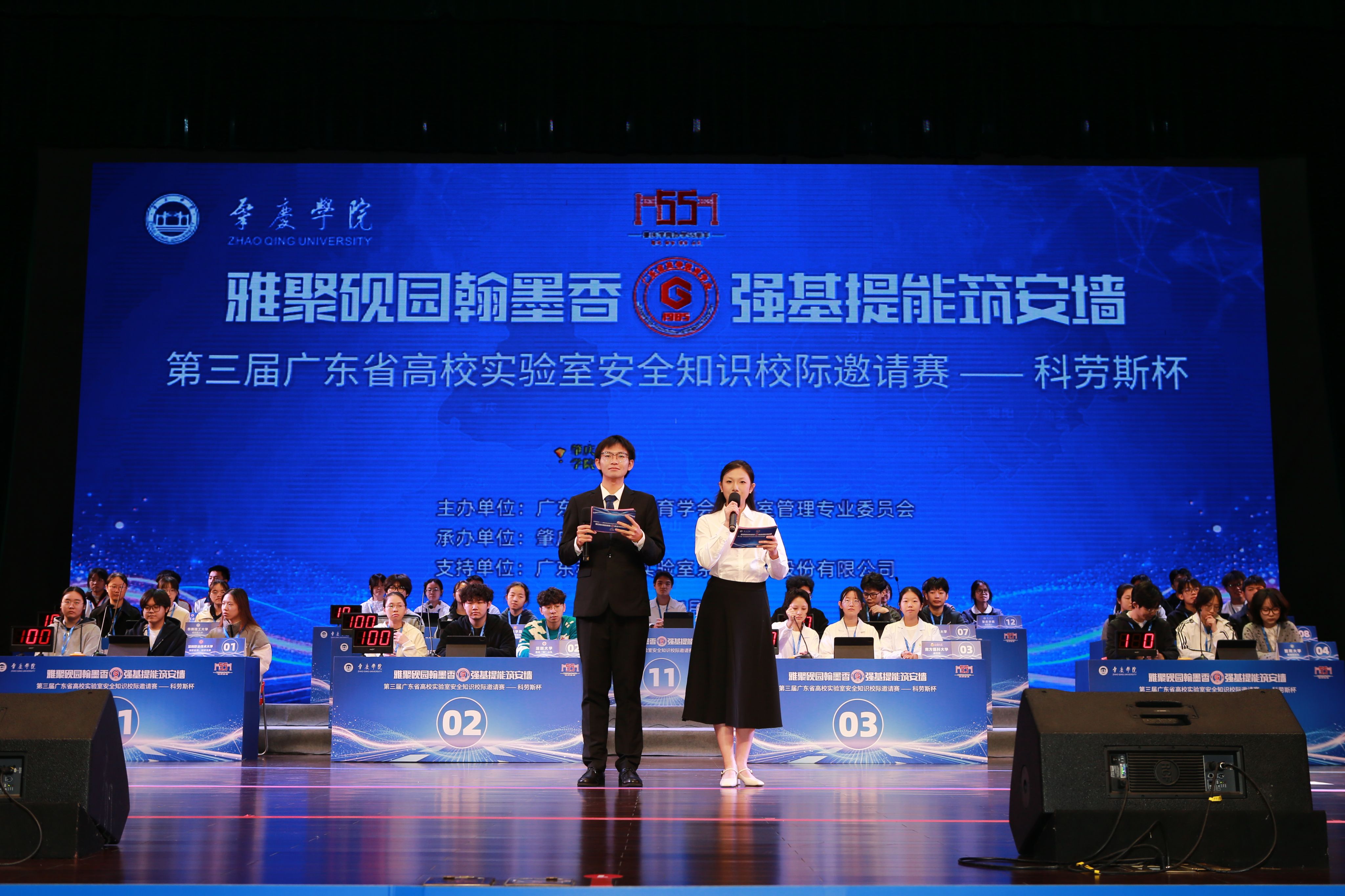 【本网讯】2025年11月20日-21日,第三届广东省高校实验室安全知识校际邀请赛(科劳斯杯)在我校肇庆艺术中心顺利举行。本次比赛由广东省高等教育学会实验室管理专业委员会主办,william威廉中文官网承办、广东科劳斯实验室系统科技股份有限公司支持。省委教育工委委员、省教育厅党组成员、副厅长唐文昊、william威廉中文官网党委书记谢冠华、william威廉中文官网副校长李新昌、广东省教育装备中心主任张建锋、广东省教育装备中心高教部部长陈亮、华南师范大学国有资产与实验室管理处处长蔡晓平、广东省高等教育学会实验室管理专业委员会秘书长宋小飞以及各高校有关部门领导出席本次活动。来自中山大学、华南理工大学、南方医科大学等全省13所高校13支代表队和师生代表、专家裁判等600余人参加了本次赛事。